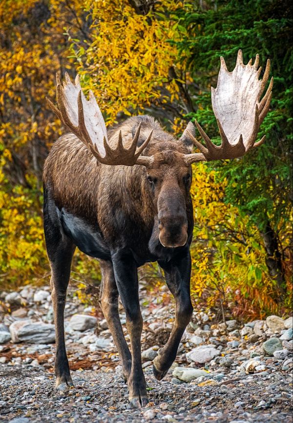 The Alaskan moose can stand over seven feet tall and weigh over two thousand pounds. They can be found only in the most remote and northern parts of North America, in the state of Alaska and Yukon Territory. I arrived in Denali National Park just as the seasons were changing. The air was getting colder, snow was mixing with rain, the leaves were turning orange and yellow, and most importantly: the moose rut was in full swing.