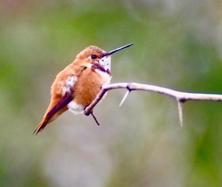 A little Rufous Hummingbird (Selasphorus rufus) visits the feeders and sits for a few minutes.