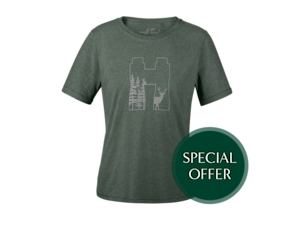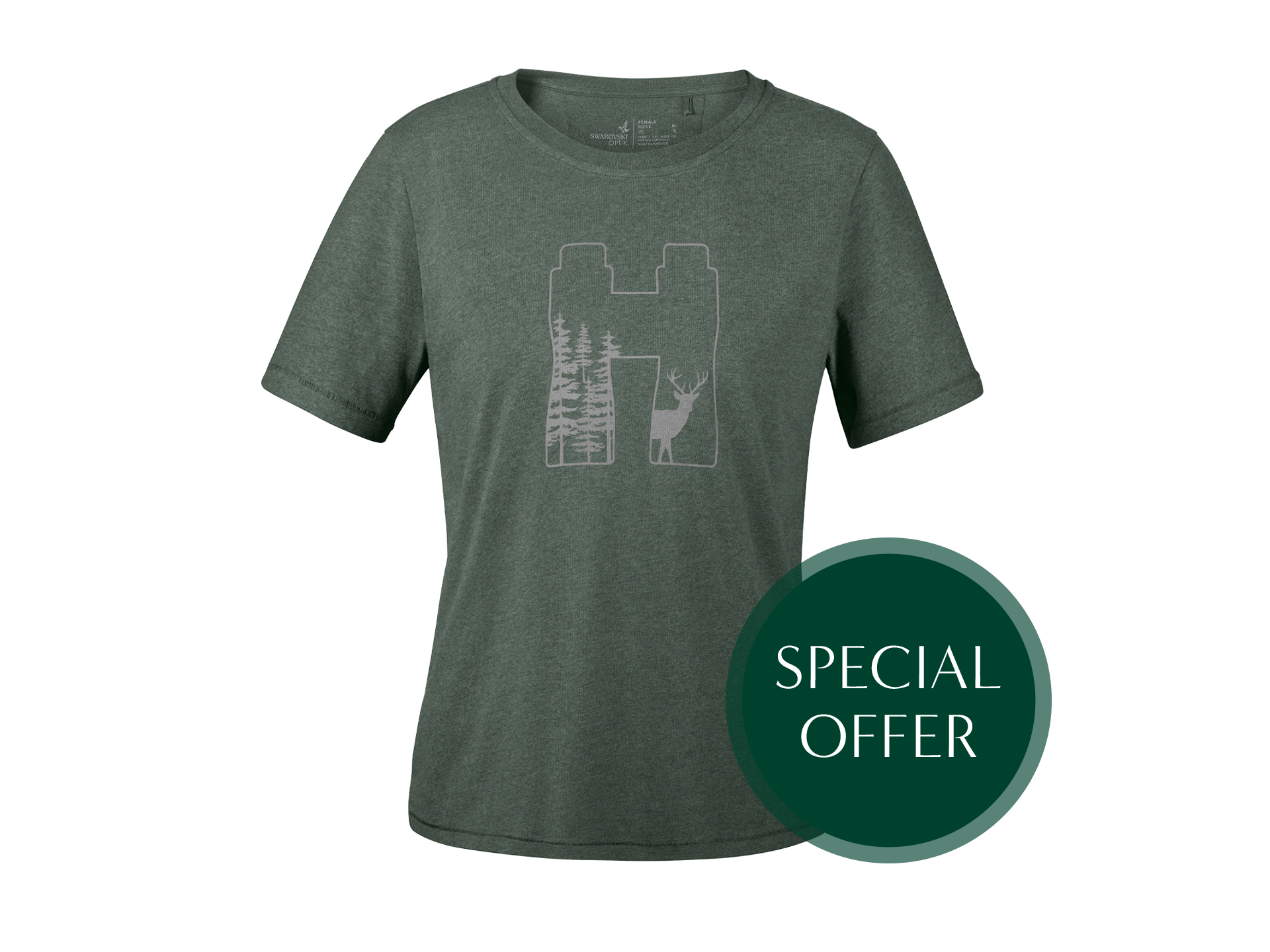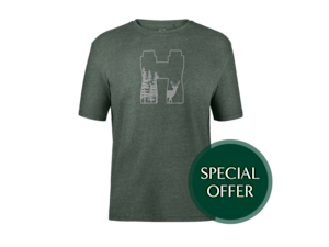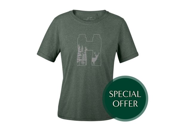 Anyone who spends a lot of time in the great outdoors knows the value of comfortable clothing. This crew neck T-shirt is made from 100% organic cotton and feels very comfortable to wear. The T-shirt is green and has a print on the front featuring binoculars and a deer in gray.