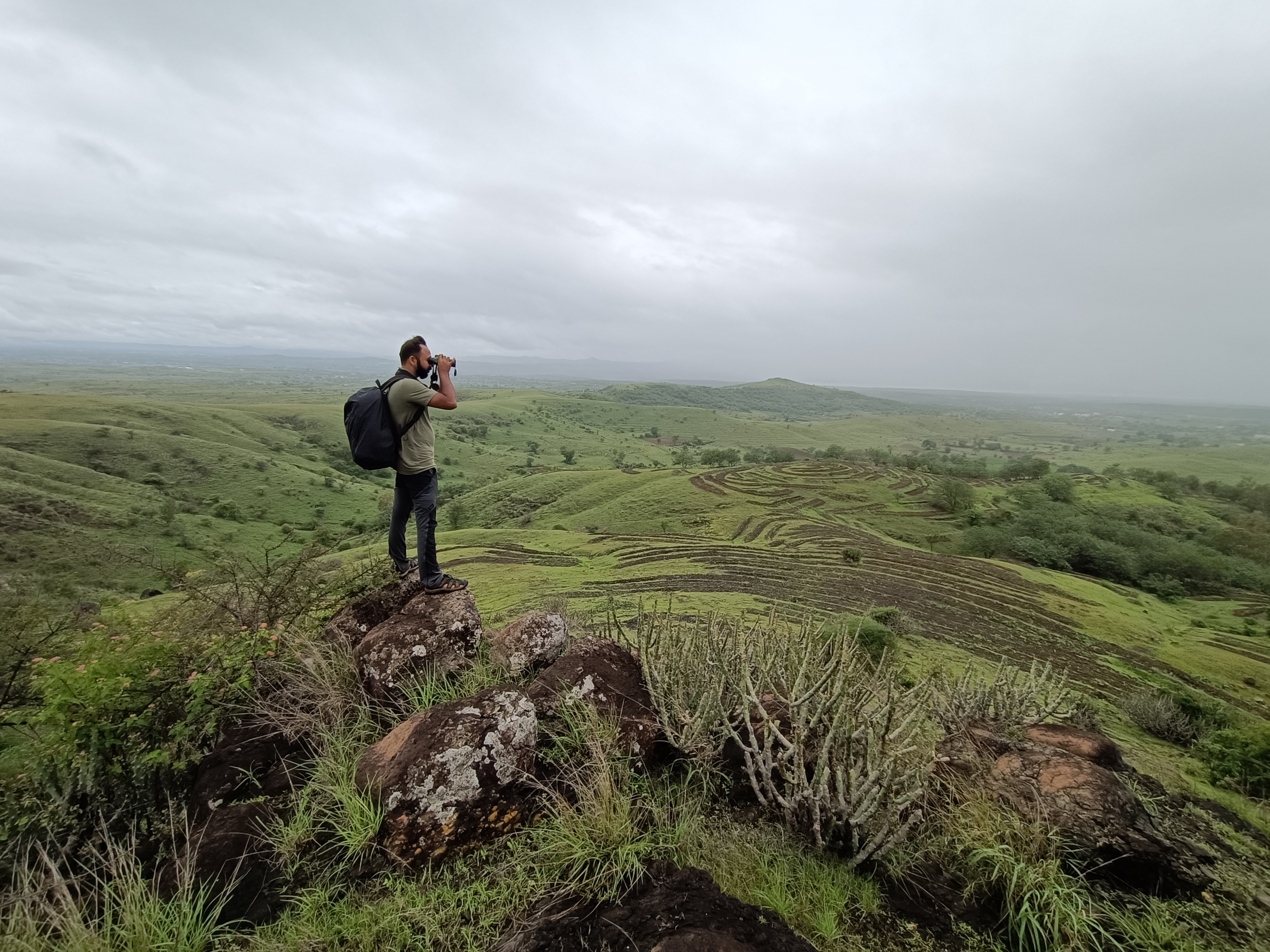 We followed our guide on foot towards the top of a rocky hillock. Jungle Prinias and White-bellied Minivets popped in and out of low bushes all around us, calling loudly, undeterred by the cold monsoon winds. On the walk he told us stories of leopards, wolves, hyenas, and boar that he had come across on his daily jaunts. Who would’ve imagined there were big cats in this treeless open landscape? Were they passing through? Or were they the result of the rapid afforestation and sugarcane farming? Or had they just adapted to this world. We reached the top pondering over such thoughts.