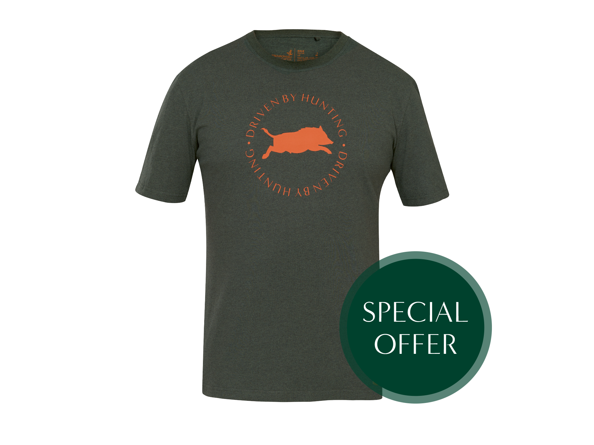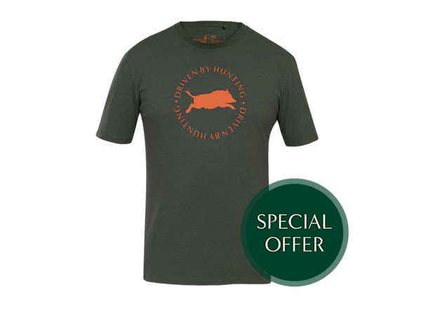 Tous ceux qui passent beaucoup de temps au contact de la nature connaissent la valeur de vêtements confortables. Ce T-shirt à col ras du cou 100 % coton biologique est très agréable à porter. Le T-shirt est vert foncé avec un imprimé de couleur burnt orange représentant un sanglier sur le devant.